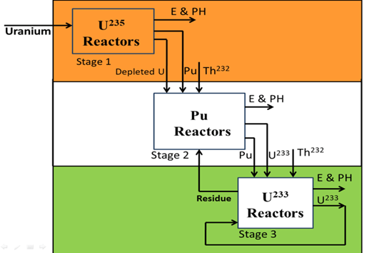 ✔ Stage III: It focuses on advanced nuclear power systems that utilize thorium-232 (Th-232) and Pu-239 to produce energy and U-233.