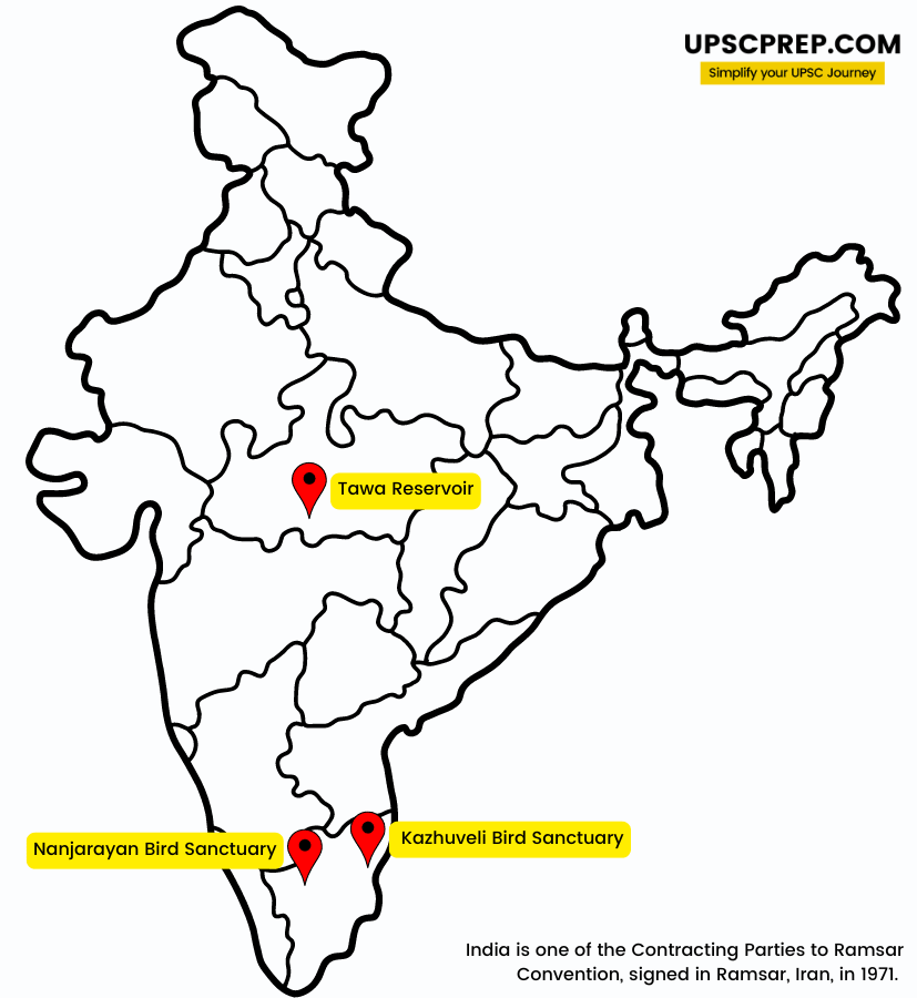 • The new additions are the Nanjarayan Bird Sanctuary and Kazhuveli Bird Sanctuary in TamilNadu, and Tawa Reservoir in Madhya Pradesh.