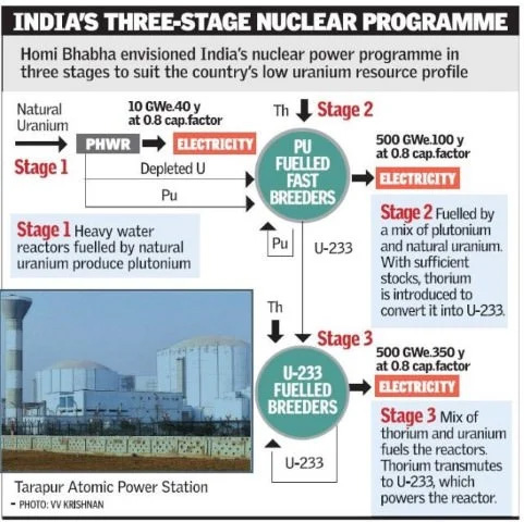 • The stages include Pressurised Heavy Water Reactors (PHWR) fueled by natural Uranium, Fast Breeder Reactors (FBR) fueled by a mix of Uranium and Plutonium from reprocessed spent fuel, and Thorium-based systems in the final stage.