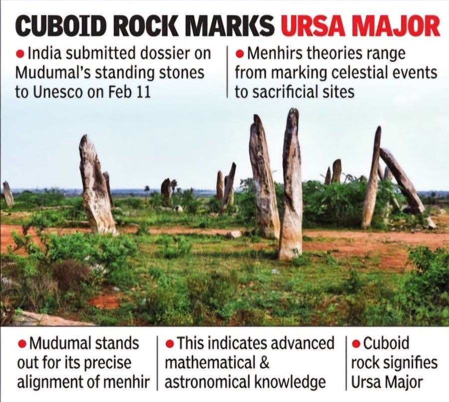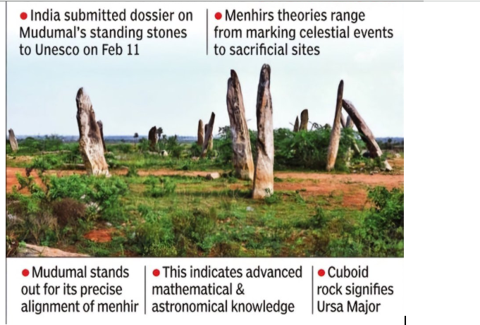 The Mudumal Megalithic Menhirs in Telangana's Narayanpet district, dating back 3,500-4,000 years, have been added to India's tentative list of UNESCO World Heritage Sites.