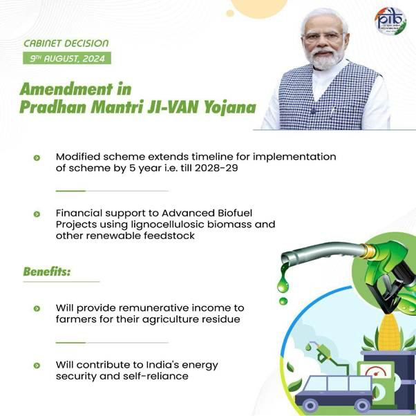 •PM JI-VAN stands for Jaiv Indhan- Vatavaran Anukool fasal awashesh Nivaran and aims to provide financial assistance to 2G Bioethanol projects made from surplus biomass and agricultural waste.