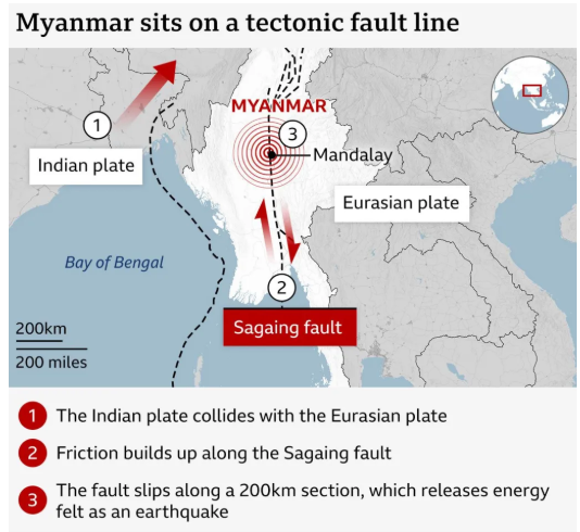 The recent earthquake in Myanmar had its source in central Myanmar, about 20 km from Mandalay, the country’s second-largest city.
